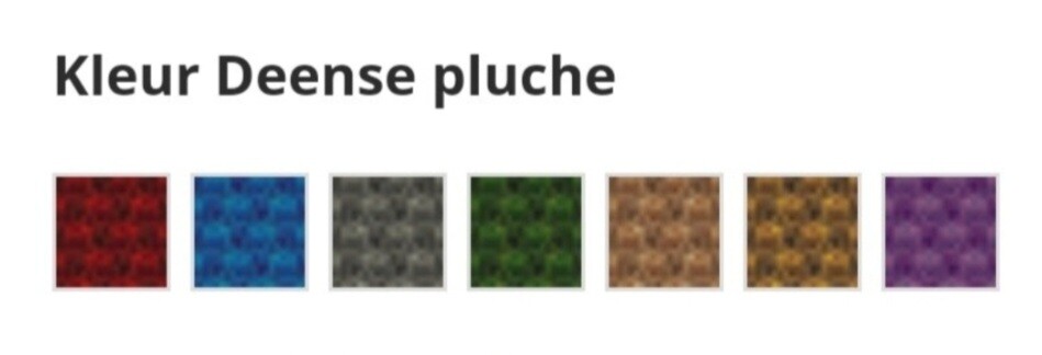 | Kleur deense pluche | Blauw, Bruin, Geel, Grijs, Groen, Paars, Rood |