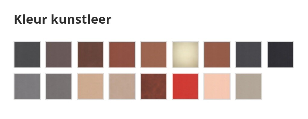 | Kleur skai | Antraciet, Beige, Cappuccino, Chocolade Bruin, Congnac, Donker bruin, Geen, Groen, Kobaltblauw, Licht bruin, Lichtgrijs, Rood, Roze, Wit, Zandkleur, Zwart |