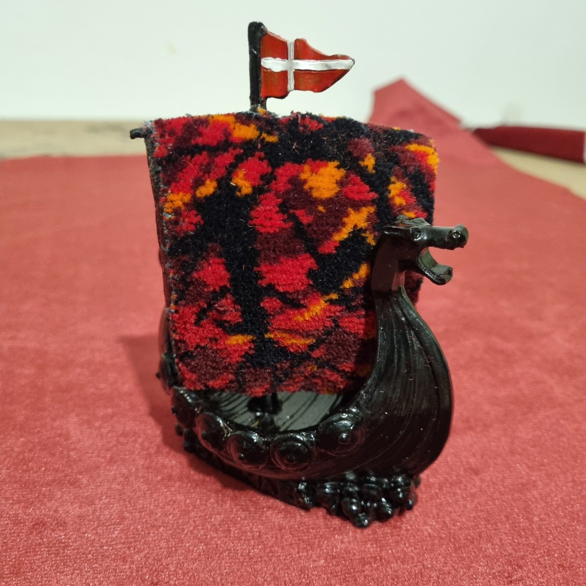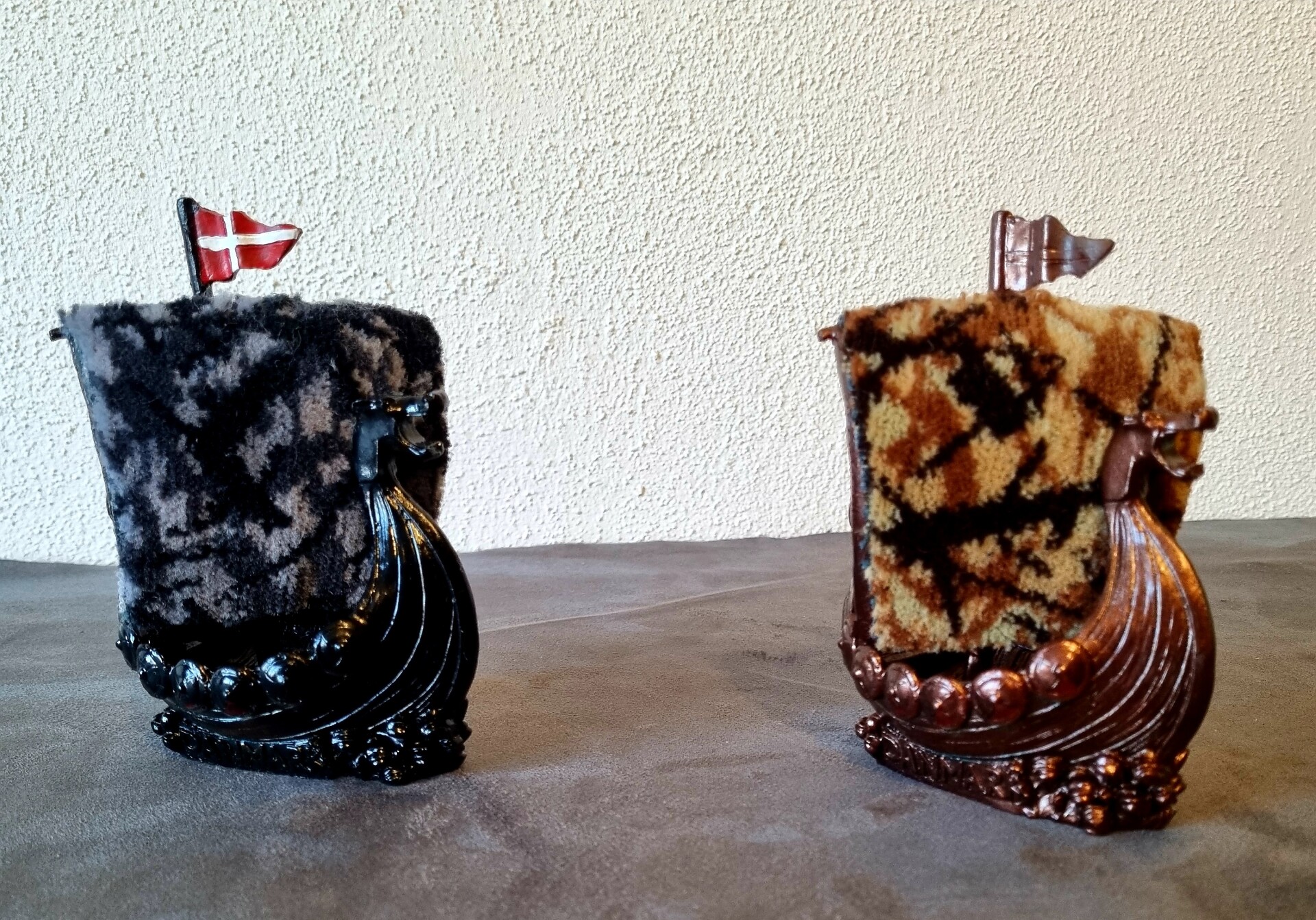 Zeil kan bekleed worden in alle kleuren deense pluche. Vikingschip kan gespoten worden in alle RAL-kleuren maar standaard is zwart, wit of brons.